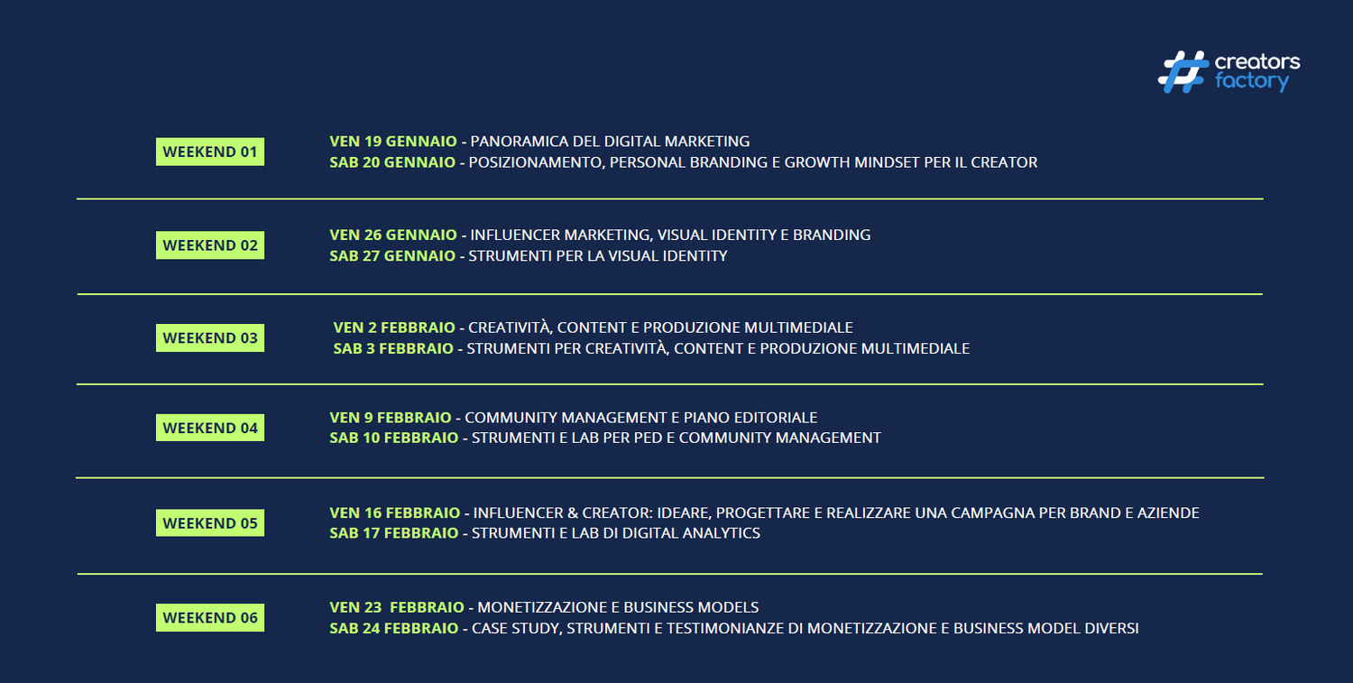6 settimane in formula weekend per imparare sul campo a creare contenuti!